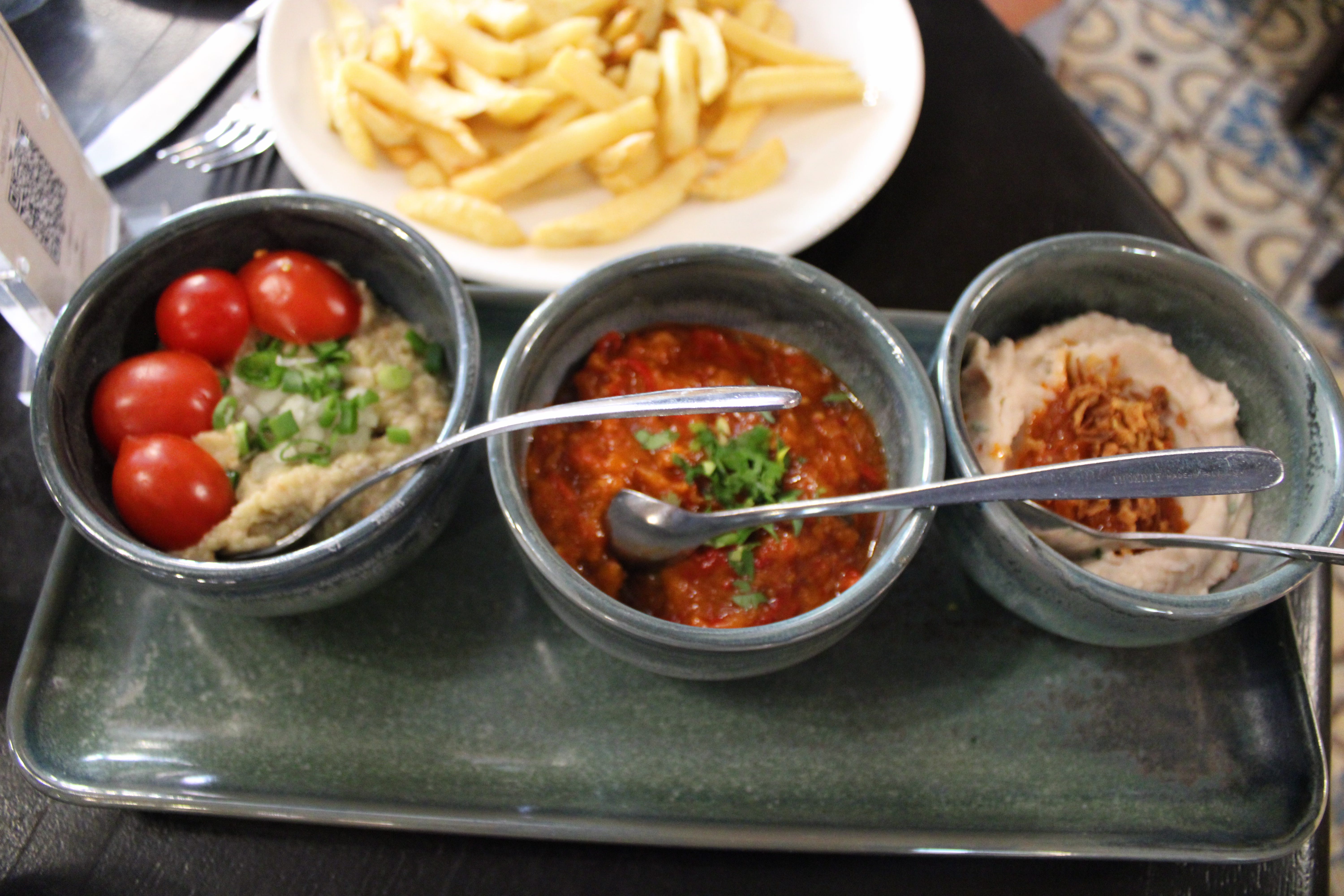 We went with local fare: a “light platter” with two eggplant dips and a bean dip to start, paired with Romanian wine. Our main meal was Bucovineană, described as a pork confit-style dish. And of course, we had to try the local liqueur, Pălincă.