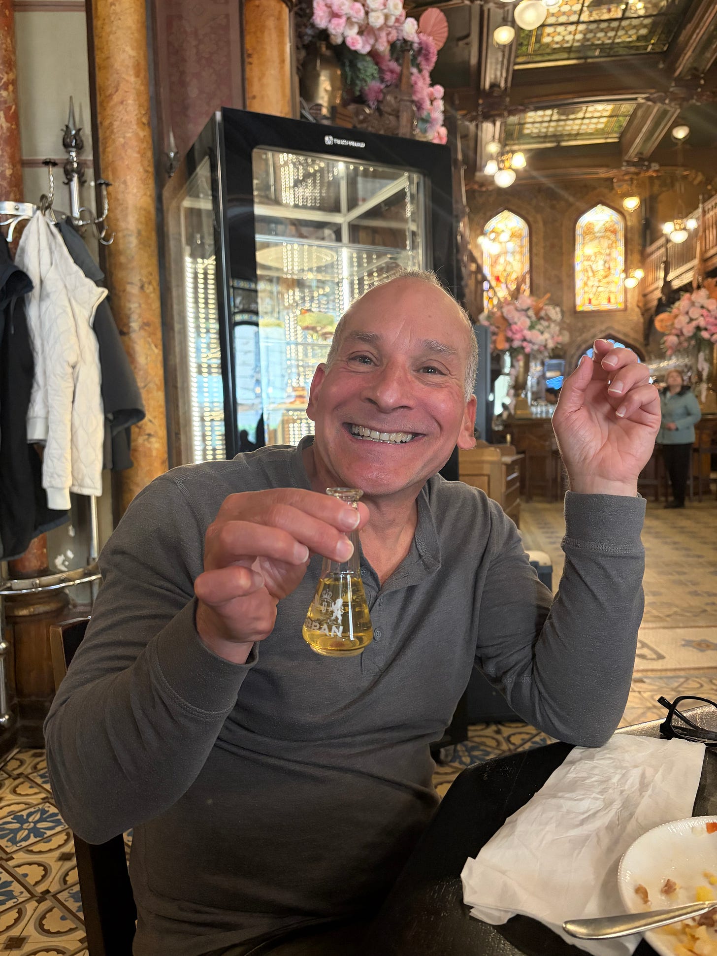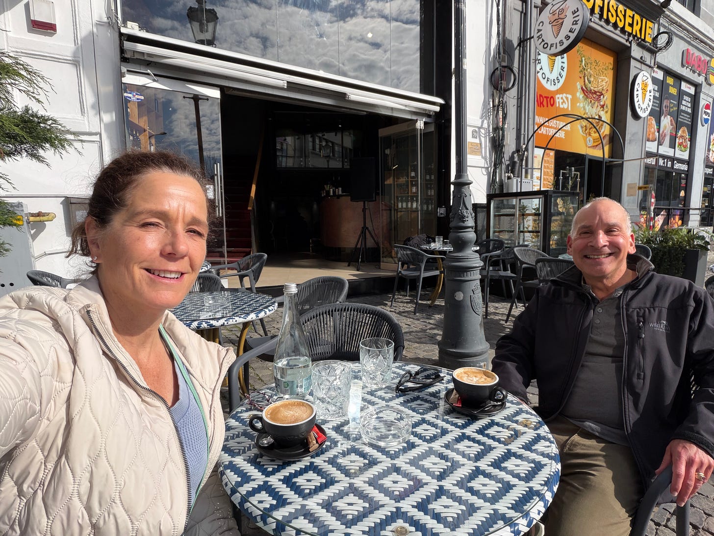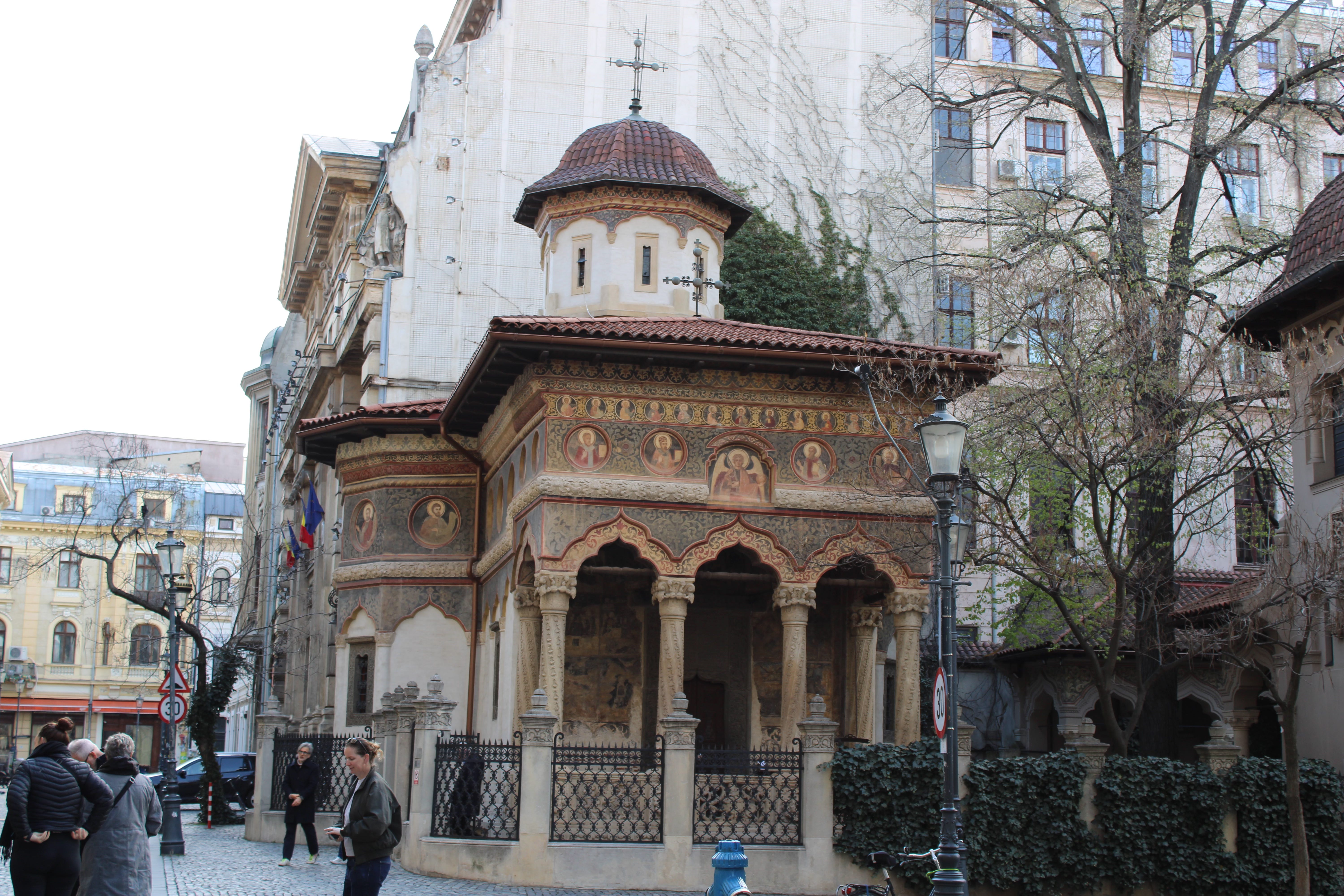 We spent Thursday exploring Bucharest’s Old Town. Since it was just over three miles away and a beautiful morning, we decided to walk. As we entered one of the main squares, the women running a café called out to us and asked if we wanted a table (this is pretty typical in touristy areas we’ve been to). We hadn’t planned to stop, but it was mid-morning, and by now, a coffee break has become part of our routine, so we said yes.