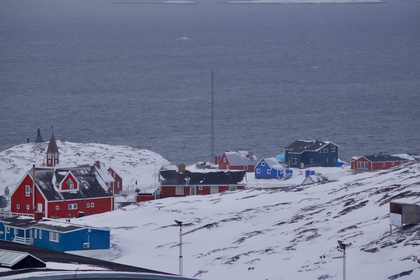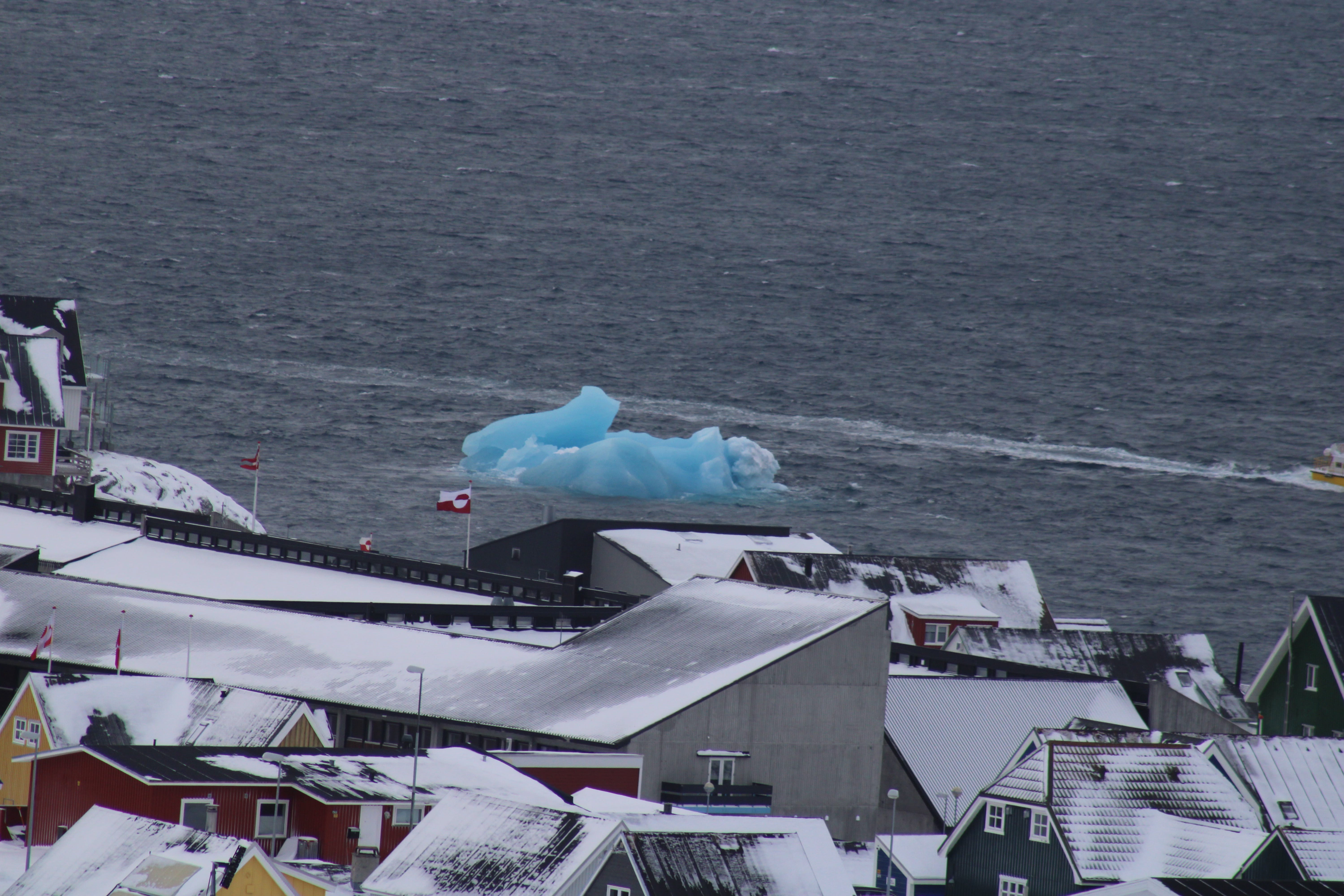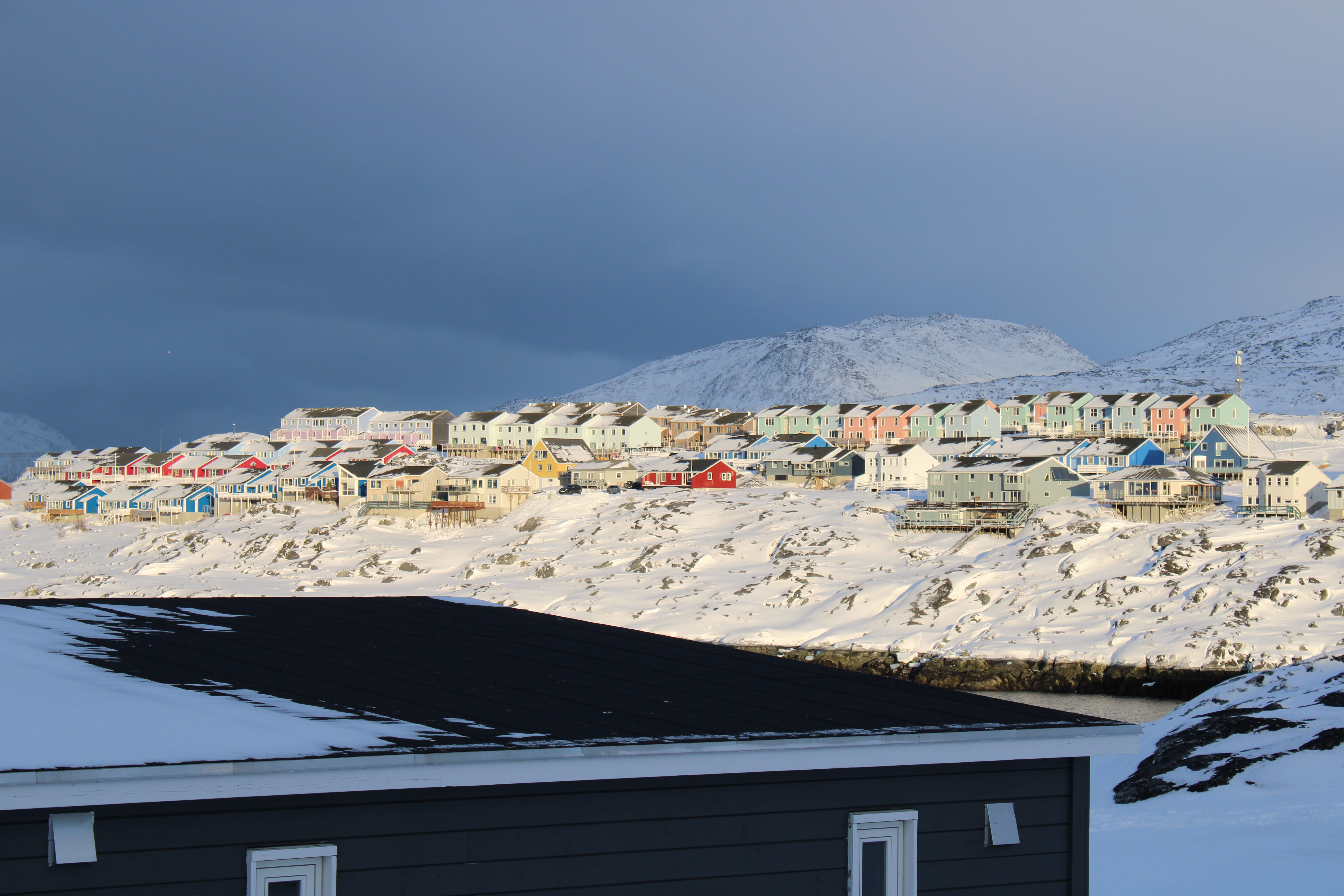 One surprise was the size of the plane from Copenhagen to Nuuk (especially compared to our plane heading to Iceland): an A330 with seating for about 305 passengers. And it was fairly full. When we arrived in Nuuk we stopped on the tarmac and watched as they wheeled stairs up to the door. We realized we weren’t quite prepared for the idea of walking outside to the terminal. We had deliberately dressed for Copenhagen weather — pants, sweaters, wool coats, and light gloves — expecting a quick transition from warm plane to warm terminal, then to a warm car and a warm apartment before changing into proper Nuuk gear. Thankfully it wasn’t as bad it looked from inside the plane: about 20 degrees with very little wind.